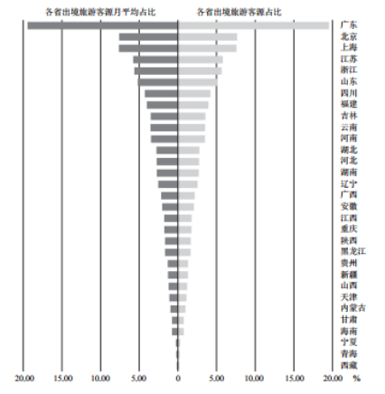 广东、北京、上海、江苏、浙江、山东等省市出境旅游人次相对较高,是我国内地(大陆)出境旅游的主要客源市场。从客源占比来看,广东省、北京市和上海市三个区域出境旅游占比各月份均高于其他省市。