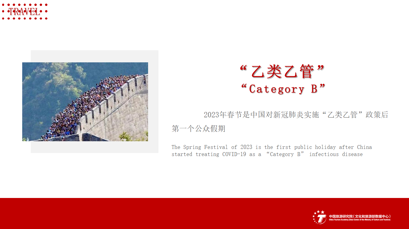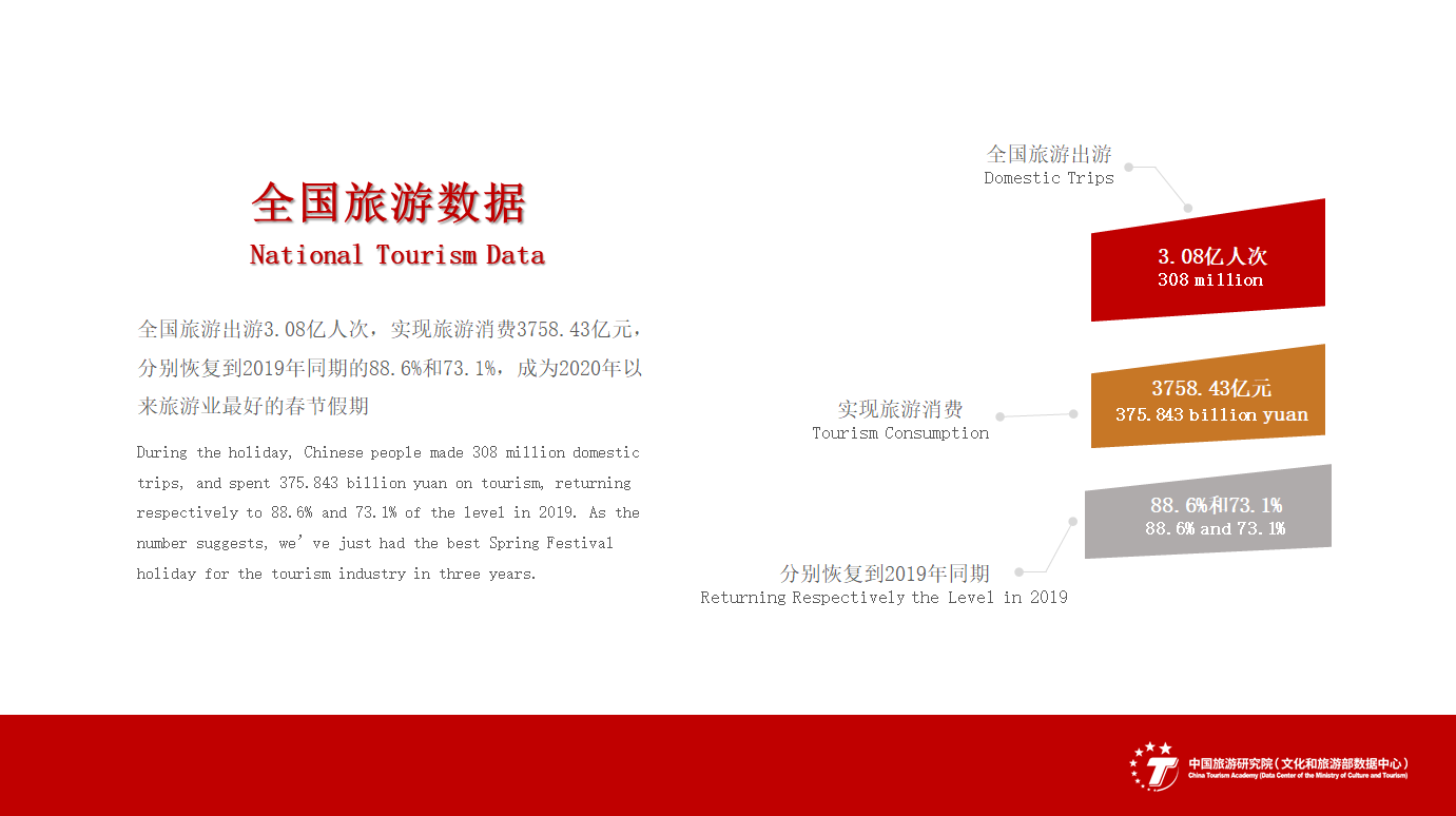 The 2023 Spring Festival is the first public holiday after China implemented the policy of "Class B and Class B management" for COVID-19. 308 million people traveled across the country, and the tourism consumption reached 375.843 billion yuan, respectively recovering to 88.6% and 73.1% in the same period of 2019, making it the best Spring Festival holiday in the tourism industry since 2020.