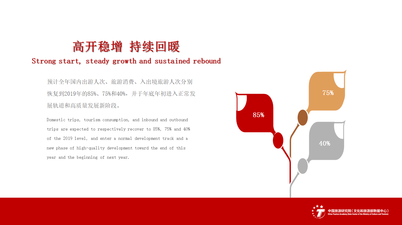 On February 6th, multiple outbound tour groups organized by travel agencies such as China Travel Service, Ctrip, Guangzhou Travel Service, Chunqiu, Caesar, and China Youth Travel Service, as well as the treatment they received in Thailand, the Philippines, and Indonesia, greatly boosted tourism consumption expectations and market confidence, further laying the market foundation for the "high opening, stable growth, and sustained recovery" of the tourism economy throughout the year. Based on macro policies such as finance, economy, consumption, investment, civil aviation, transportation, and inbound and outbound management, as well as leading indicators such as residents' willingness to travel, employee recruitment, entrepreneurial confidence, and destination promotion, we have reason to maintain an optimistic outlook for China's tourism economy in 2023. It is expected that the number of domestic tourists, tourism consumption, and inbound and outbound tourists for the whole year will recover to 85%, 75%, and 40% of 2019, respectively, and enter a normal development track and a new stage of high-quality development by the end of the year and the beginning of the year.