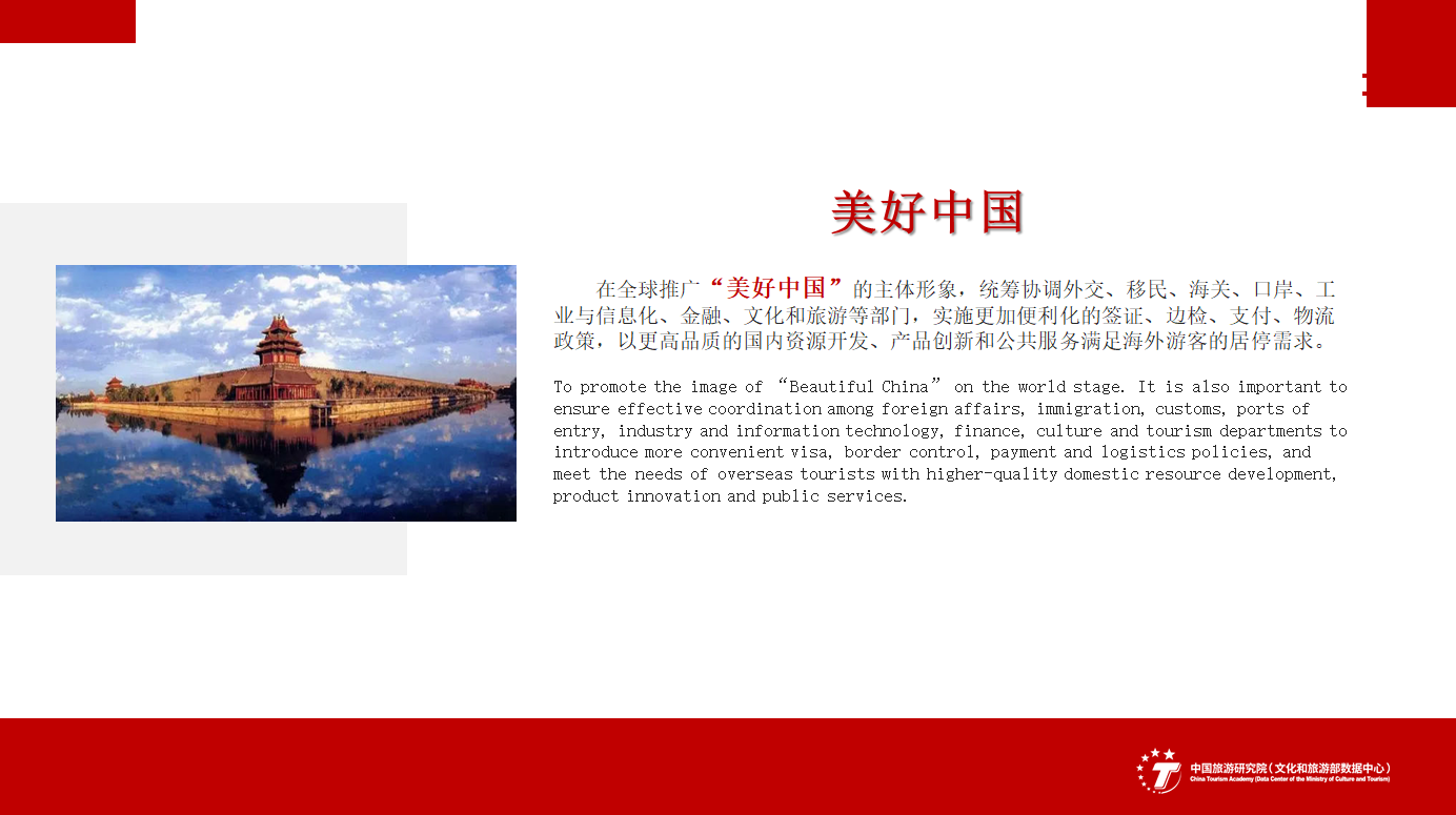 China will actively practice the green tourism development model guided by ecological civilization. Respecting, conforming to, and protecting nature is an inherent requirement for the comprehensive construction of a socialist country and a fundamental principle that must be followed in the development of tourism in the new era. Green mountains and clear waters are also gold and silver mountains, and icy landscapes are also gold and silver mountains. Mountains, waters, forests, fields, lakes, grasses, and sands are interdependent communities of life. Guided by the concept of ecological civilization, the country will build a number of green tourism pilot zones. The development concept of green tourism will implement the entire process of resource development, investment and construction, product research and development, enterprise operation, and market promotion, and form a batch of replicable and promotable experiences. The country will further increase the promotion of civilized tourism based on documents such as the "Convention on Domestic Tourism Civilization" and the "Guidelines for Outbound Tourism Civilization", guiding tourists to coexist harmoniously with nature, support cultural heritage, and communicate equally with local residents. China will strive to build a new realm of civilized tourism with an open and shared main theme. Tourism is the inheritance and creation of culture, the spiritual enrichment contained in Chinese path to modernization, and the equal dialogue between different civilizations, cultures and nations. Reading thousands of books and traveling thousands of miles has been an excellent tradition of the Chinese nation since ancient times, and traveling abroad is particularly desirable for the people. Through the "Asian Tourism Promotion Plan", the "the Belt and Road" initiative, the Shanghai Cooperation Organization, APEC and other multilateral mechanisms, as well as bilateral activities such as mutual tourism years, we will give better play to the World Tourism Alliance, the World Tourism Cities Federation, the International Mountain Tourism Alliance and other industry organizations, so that countries and regions can share the development opportunities of China's outbound tourism. In the process of developing outbound tourism, the government will pay more attention to tourist safety and service quality, rather than seeking to maintain a service trade surplus with any country at any time. We also need to implement the inbound tourism revitalization plan at the national level, promote the main image of "Beautiful China" globally, coordinate and coordinate departments such as diplomacy, immigration, customs, ports, industry and information technology, finance, culture, and tourism, implement more convenient visa, border inspection, payment, and logistics policies, and meet the accommodation needs of overseas tourists with higher quality domestic resource development, product innovation, and public services.
