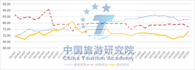 图2:2014Q1-2023Q1全国游客满意度现场、网络、投诉指数
