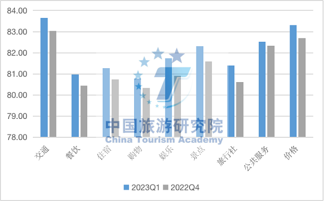 全国游客满意度稳定在“满意”区间且实现环比增长。2023年一季度全国游客综合满意度指数80.41,季度环比增长0.29%,低于2022年一季度同期水平(81.52)。2022年,疫情防控形势下全国游客满意度出现2016年以来的首次下降,进入2023年,全国旅游市场回归安全、有序轨道,居民出游意愿和消费信心逐步恢复,游客取得感和幸福感增加,游客满意度整体呈现企稳回升态势。